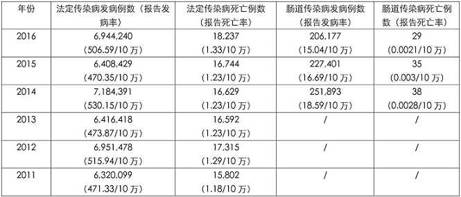 目前除脊髓灰質(zhì)炎和腸道病毒 71 型外,尚無疫苗 可供預防,是當前嚴重影響人類健康的重要病原之一。據(jù)國家 CDC 法定傳染病報告統(tǒng)計(大陸地區(qū),下同)網(wǎng)站公布的數(shù)據(jù)(見表 1),按甲乙類傳染病傳播途徑,自 2011 年以來腸道傳染病發(fā)病例數(shù)連續(xù)六年居于榜首。