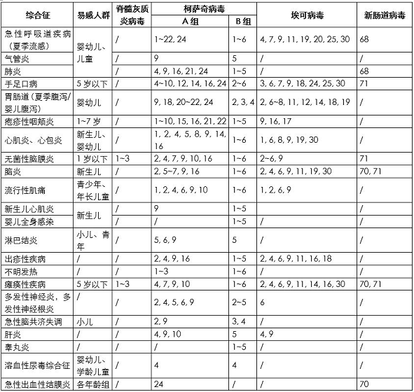 腸道病毒感染在兒童時期尤為多見。其中柯薩奇 病毒、埃可病毒識別的受體在組織和細胞中分布廣泛,包括中樞神經(jīng)系統(tǒng)、心、肺、胰、粘膜、皮膚和其它系統(tǒng),因而引起的疾病譜復雜,如呼吸道感染、散發(fā) / 爆發(fā)性腦膜炎、腦炎、心肌炎、心包炎、手足口病、皰疹性咽峽炎、嬰兒腹瀉、流行性胸痛、發(fā)熱、出疹性疾病、 散發(fā)性脊髓灰質(zhì)炎麻痹癥以及流行性急性眼結(jié)膜炎等(詳見表 2)。